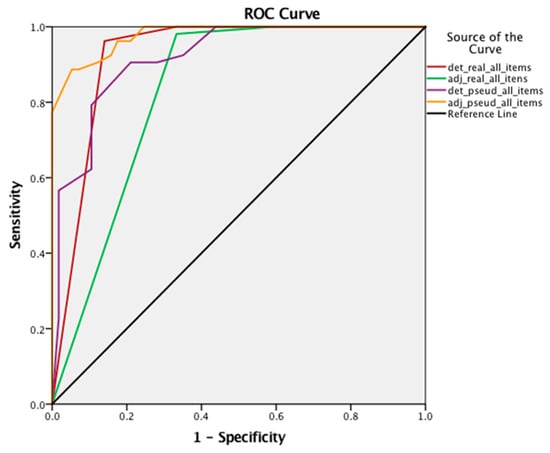 Finally, a separate ROC analysis was run to examine the existence of positive discrimination between the study’s groups in the assessment subtypes, as these were defined both by gender and noun type (real or pseudo) (3 × 3). The results showed a high positive discrimination between the two groups in four item subtypes. Figure 3 presents the ROC curve, while Table 7 shows the cut-off scores, the AUC and the p-value.