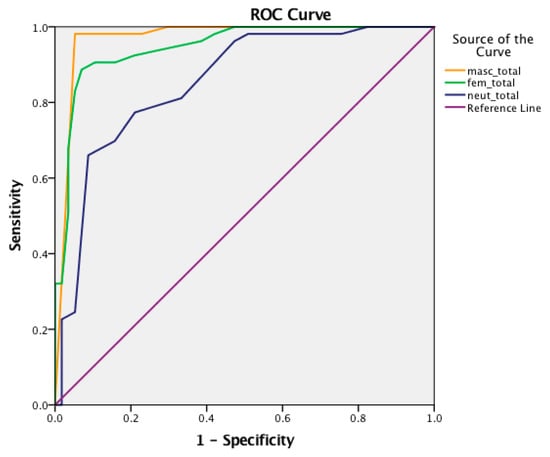 The AUC scores were excellent and ranged from 0.852 to 0.969, with the highest scores attained in the masc_total scores followed by the fem_total scores. The cut-off scores in the masculine items were calculated at almost 82, close to the highest end of the measure, while in the feminine nouns they were almost 58/60 and, in the neuter, almost 63/68.