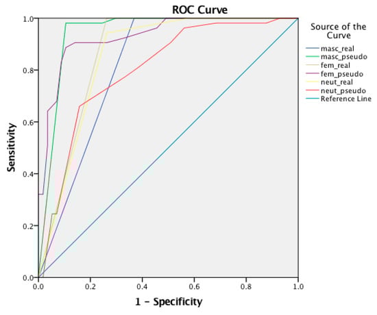 The AUC scores are excellent, ranging from 0.801 to 0.943, with the highest scores attained in the masc_pseudo items followed by the fem_pseudo items. The cut-off scores in the real items is calculated at 34.5/36 across gender types, while in the pseudo items for the feminine items, it is calculated at 21.5/32, in neuter at 27/5/32, which is higher, while in masculine at 45.8/48.