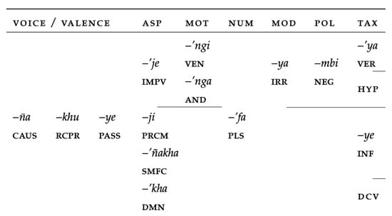 Of particular interest here is the morphology that can be attached to the verb. As discussed in detail by (), verbs can take a range of derivational and inflectional suffixes within a fairly rigid template, in which maximally one morpheme from each column is allowed in the verbal form (see also ()). The most relevant part of the template, in Figure 1, shows (in order) the range of voice/valence, aspectual, associated motion, number agreement, modal, polarity, and other suffixes.2 There are also various other information structural clitics and other material that occur further to the right of the template, as shown here, though some are limited to matrix clauses. Horizontal lines cannot be crossed, indicating complementarity (e.g., precumulative -ji cannot co-occur with andative ’nga). See () for details.