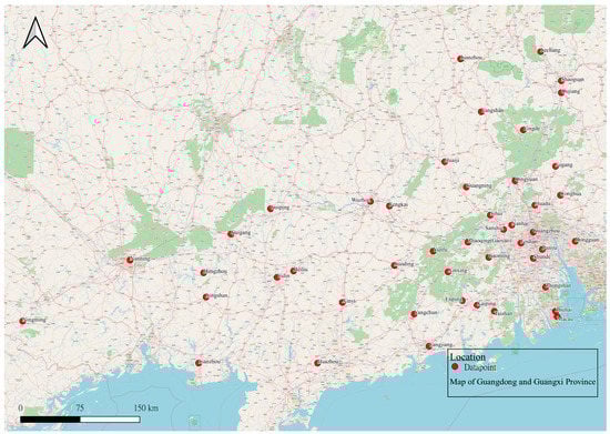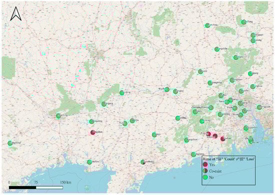 Similar to the case with Lèchāng, the contrast between *-iun/iut and *-in/it, as well as the pronunciation of “出” with final [yt] in Nánníng might have been brought by migrants. Migration to Guǎngxī Province from the Pearl River Delta following the lifting of maritime prohibitions after the First Opium War (1839–1842), as well as that by people escaping the effects of World War II in later times, led to the formation of the large Yōngxún Yuè community in Nánníng. The language of that community is difficult to distinguish from that of Guǎngfǔ Yuè (; ). This situation provides a plausible explanation for the differing classifications of Nánníng Yuè in the Language Atlas of China and (); () (Table 1). In light of the phonological features shared between Nánníng and the Pearl River Delta, even with geographical constraints (illustrated in Figure 3 and Figure 4), it is conceivable that the contrast between *-iun/iut and *-in/it, as well as the pronunciation of “出” with [yt] were brought by migrants from the Pearl River Delta to Nánníng.
