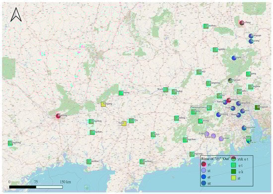 The dataset of this study includes 46 Yuè varieties (Supplementary Material). Sites with [yn]/[yt] in the reflexes of either *-iun/iut or *-un/ut or both were selected from A Survey of Dialects in the Pearl River Delta (), A Survey of Yue Dialects in North Guangdong (), Guǎngxī Tōngzhì: Hànyǔ Fāngyánzhì 广西通志•汉语方言志 [Compilation of Chinese Dialects in Chronicles of Guangxi] (), A Survey of Yue Dialects in West Guangdong () and Guǎngxī Hànyǔ Fāngyán Yánjiū 广西汉语方言研究 [A Study on Chinese Dialects in Guangxi] (). Thereby, the dataset of this study included Guǎngzhōu (Urban), Macau (Urban), Pānyú (Shìqiáo 市橋), Huādū (Huāshān 花山), Cónghuà (Urban), Fóshān (Urban), Nánhǎi (Shātóu 沙頭), Shùndé (Dàliáng 大良), Sānshuǐ (Xīnán 西南), Gāomíng (Míngchéng 明城), Zhōngshān (Shíqí 石岐), Zhūhǎi (Qiánshān 前山), Qīngyuǎn, Fógāng, Yīngdé (Hánguāng 浛洸), Yángshān, Liánzhōu 連州 (Qīngshuǐ 清水), Sháoguān, Qūjiāng (Mǎbà) 曲江 (馬壩), Lèchāng, Nánníng, Yùlín, Wúzhoū, Zhàoqìng (Gāoyào), Sìhuì, Guǎngníng, Huáijí, Fēngkāi (Nánfēng 南豐), Yúnfú (Yúnchéng 雲城), Xīnxīng 新興, Luódìng, Guipíng (County seat), Héngzhōu (County seat), Guìgǎng (Nánjiāng 南江), Běiliú (Tángliáo 唐僚), Língshān (County seat) and Língmíng (County seat).5 Dōngguǎn (Guǎnchéng 莞城), Táishān (Táichéng 台城), Kāipíng (Chìkǎn 赤坎), Ēnpíng (Niújiāng 牛江) and Liánzhōu 廉州 were also taken into the dataset to cover more Yuè subgroups and facilitate spatial distribution analysis of *-un/ut or *-iun/iut, although [yn]/[yt] are not reflected in the reflexes of these two groups in these sites. For the same reasons, Huàzhōu (Xiàjiāng 下江), Yángjiāng, Yángchūn (Hékǒu 河口) and Xìnyí were chosen as well from Huàzhōu Yuèyǔ Gàishuō 化州粤语概说 [An outline of Huazhou Yue] (), Study of Yangjiang Dialect in Guangdong Province China (), The Phonological Study on Yue Dialect of Hekou in Yangchun City () and Xìnyí Fāngyánzhì 信宜方言志 [Compilation of Chinese Dialects in Xinyi] (). All 46 data sites as well as their given classification are shown in Table 1 (underlined).