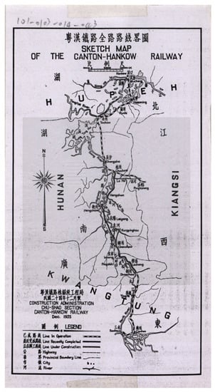 - Construction Administration Chu-Shao Section Canton-Hankow Railway. 1935. Sketch Map of the Guangzhou–Hankou Railway 粵漢鐵路全路路線畧圖. Hsinchu: National Yang Ming Chiao Tung University Library. Available online: https://nctuhistory.lib.nycu.edu.tw/list_detail.aspx?url=5&cultID=693&search_mode=1 (accessed on 8 January 2023).