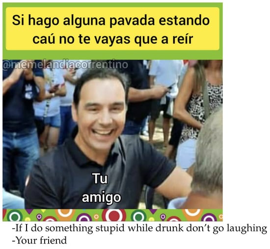 The key consideration for this analysis is not what does and does not count as a meme7 but rather that a central property of memes is their sociocultural relevance, often to narrow or relatively small social groups. Such memes must necessarily be created by a member of such a social group (or someone with a thorough understanding of the group norms and values) and are likely to only be fully understood or appreciated by a member of the same group. For instance, while the general content of the meme provided in Figure 1 is easily interpretable by anyone, there is an additional layer of content that grounds the meme locally: the man laughing in the photo is the current governor of Corrientes, Gustavo Valdés.