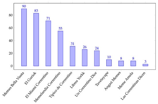 The sources of the memes are 11 Instagram pages that are run by Correntinos and intended for Correntinos; these pages were chosen via an in-depth survey of Correntino Instagram pages, and all pages that were thematically locally oriented were included. These pages, along with their Instagram handle,8 number of followers, and the location out of which each page is run, are provided in Table 1. Additionally, a map of the province is provided in Figure 2, in which each of the locations in Table 1 is indicated. Some pages contributed more memes to the corpus than others, as some were much more prolific and active in posting than others. The number of memes from each specific source page is found in Figure 3.