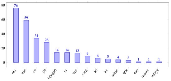 The lexical loans from Guarani in Correntino Spanish are numerous, and the corpus reflects this, with a wide variety of loans being represented from various semantic fields. The grammatical loans, however, are more restricted, with 15 total being registered in the corpus. The number of occurrences of each is given in Figure 4, followed by a description of the Guarani source form and the meaning of the resulting Spanish loan in Table 2.