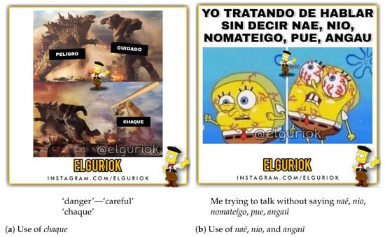 In Figure 9a, we see the Guarani loan chaque, meaning ‘[be] careful’ or ‘look out,’ being used in a meme which takes imagery from an advertisement for the 2021 film Godzilla vs. Kong. The standard Spanish forms peligro ‘danger’ and cuidado ‘[be] careful’ are seen fighting, overlaid on images of Godzilla and King Kong, only to be chased away by chaque with a baseball bat, which is overlaid on an image of a dog (which is itself a reproduction of the popular “Cheems” meme, in turn an iteration of the “Doge” meme). The implication of this meme—that chaque is the superior of the three terms, as the others are seen fleeing from it while it chases them away with a baseball bat—is relatively straight-forward.