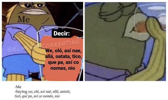In Figure 9b and Figure 10, we see variations of a recurring theme in the corpus: that of Correntinos being unable to avoid using Guarani loans, in particular the more frequent grammatical loans. In Figure 9b, we see the cartoon character SpongeBob SquarePants in two stages of increasing physical discomfort. The caption “Me trying to talk without saying naé, nio, nomateígo,24 pue,25 angaú”, when linked with this visual, communicates the idea that to attempt to speak without using these words is a source of visceral discomfort.