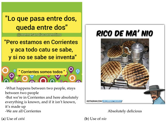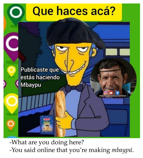 Returning to the corpus under discussion here, we frequently see the same kind of humorous connections between “Correntinoness” and linguistic features at play but via lexical items in lieu of phonological features. To take the most obvious class of examples, various memes make metalinguistic reference to Guarani loans, and examples of this are provided in Figure 9 and Figure 10.