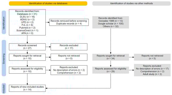 We searched the following databases from the beginning of their records until 2022: De La Salle University (DLSU) library, Ateneo de Manila University (ADMU) library, University of the Philippines Diliman (UPD) library, Philippine Journal of Linguistics (PJL), Pubmed, ScienceDirect, and the American Psychological Association (APA). We searched for Tagalog AND child AND acquisition within the title or keywords. For DLSU, we searched within the subject because there were many irrelevant hits when looking within keywords. For PJL, we used OR as the Boolean operator. This search resulted in 31 reports with 4 duplicates (see Figure 1 for the PRISMA flowchart). The records were then screened based on their titles if they focused on (1) Tagalog, (2) children’s acquisition, and (3) morphosyntax. The 10 that passed the screening were then assessed for full eligibility (i.e., focusing on nominal and verbal errors in production), removing a total of 4 papers (2 without a description of production errors, 2 focusing on comprehension), which resulted in 6 papers.