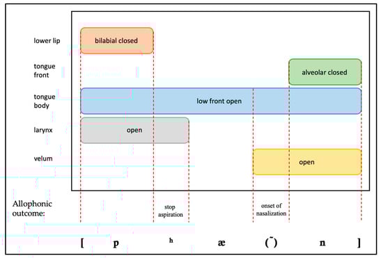 One might think that theories about sound articulation in L2 and HL speakers are abundant considering the increasing interest these populations have received in recent years. The reality is otherwise, as most theories within the field of sound articulation revolve around L1 production, such as Browman and Goldstein’s (1992) Articulatory Phonology. This theory considers that the phonology of a language is simply a gesture of commands that ‘overlap’ with each other across time and result in different types of (co)articulatory outcomes. Figure 1 shows a gestural representation of the word pan [phãn] following Articulatory Phonology.