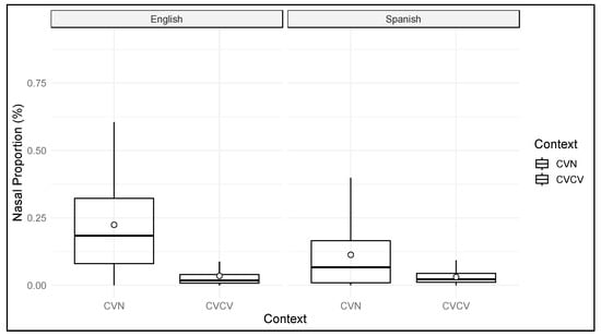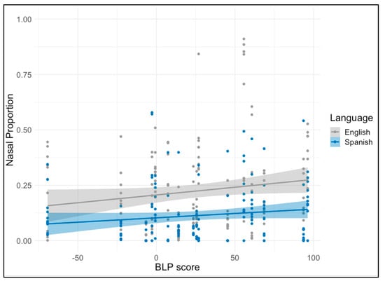 The BLP Score was considered within a continuum. Although the linear mixed-effect model did not yield significant effects for that score, a Pearson correlation test between degree of vocalic nasalization within /CVN/ sequences and BLP Score was conducted to further investigate the influence of degree of bilingualism. Figure 5 shows the correlation between degree of nasality proportion (y-axis) and BLP Score (x-axis). No strong correlation value was found in either of the languages (Spanish: R = 0.13, p = 0.11; English: R = 0.16, p = 0.05). As shown in Figure 5, a clear effect of language is apparent. The tendency to increment nasality degree appears as participants’ BLP Scores increase, and are therefore more English-dominant, but the difference is not significant. Therefore, HSs behave in similar ways cross-linguistically.