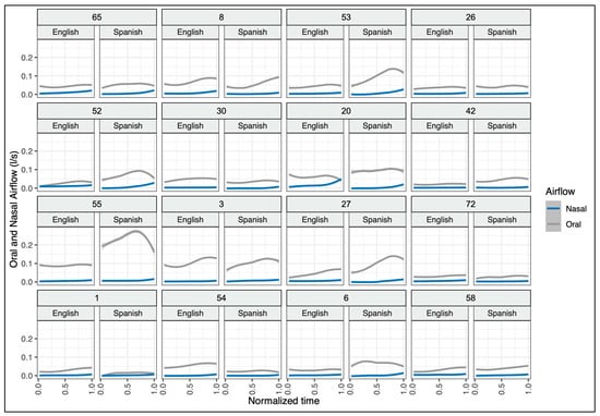 Moreover, as mentioned in Section 4.5.2, the time dynamics of oral and nasal airflow patterns in nasalized vowels was further explored. In Figure 4, the x-axis represents normalized time, which includes 40 points per vowel segment from onset to offset, while the y-axis represents the velocity of the nasal and oral airflow (in L/s). The plots are organized following linguistic dominance, as presented in Table 6. The blue line represents nasal airflow while the grey line represents oral airflow. Notice that the oral airflow exhibits greater magnitude than the nasal one, which is to be expected as the oral aperture (the mouth) is larger than the nasal one (two nostrils).