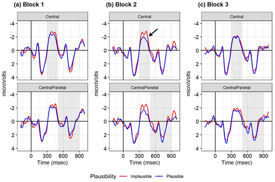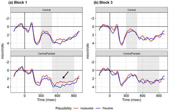ERPs at the sentence-final word in the NP-coordinations for the central and centro-parietal regions, averaged for each of the electrode regions analyzed. Negative polarity goes upwards on the y-axis. Red line: conditions in which the critical noun is implausible given the preceding verb; blue line: conditions in which the critical noun is plausible given the preceding verb. Shading indicates the time window analyzed. Arrow indicates the sentence-final plausibility effect in block 1. (a) Block 1; (b) block 3.