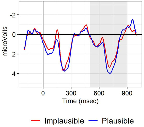 ERPs at the disambiguating verb in block 2 (S-coordinations) for the centro-parietal region, averaged for the electrode in the region analyzed. Negative polarity goes upwards on the y-axis. Red line: condition in which the critical noun is implausible given the preceding verb; blue line: condition in which the critical noun is plausible given the preceding verb. Shading indicates the time window analyzed according to the preregistered analysis.