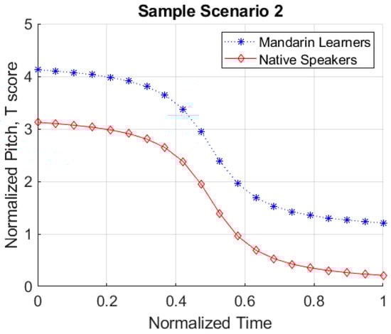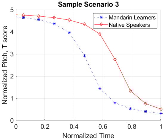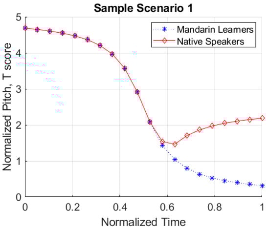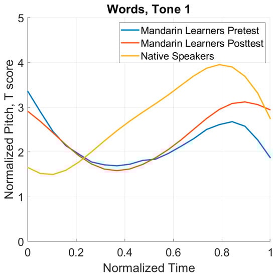 Second, normalized time is plotted against T values, calculated by converting normalized F0 values to their logarithms, resulting in a value from 1–5 (e.g., see ). For example, () extracted 11 sample F0 points from the tone productions in their study and converted them to their logarithms, resulting in 11 T values for each word. An example of a time series plot from () can be seen below in Figure 2 for Mandarin Tone 1. These time series visualizations provide a characterization of exactly how aspects of different contours may diverge (e.g., in pitch height or contour), which differs significantly from the binary “correct/incorrect” result gained from the native speaker judgements often used.