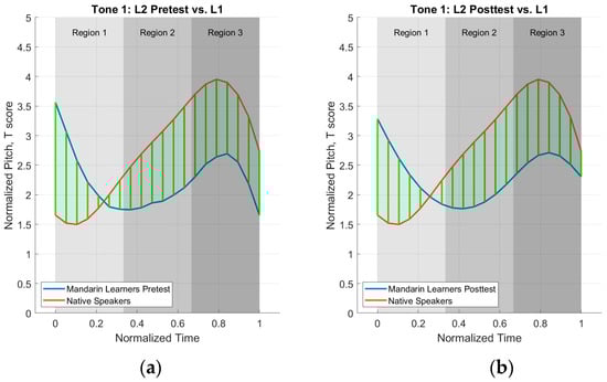 Tone 1 deviation plots. (a) L1 vs. L2 pretest averages; (b) L1 vs. L2 posttest averages.