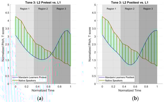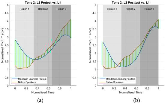 Tone 2 results show that the L2 speakers were more L1-like at the posttest for regions 1 and 3 but more L1-like at the pretest in region 2, visualized in Figure 7. Additionally, results from Table 3 show L2 speakers’ pretest and posttest pitch heights were produced lower than the L1 speakers for regions 2 and 3 but higher than L1 speakers in region 1. This second analysis provides information on where the posttest is closer to the L1 speakers (regions 1 and 3) compared to the first analysis, which only states that the posttest deviated less from the L1 speakers than the pretest.