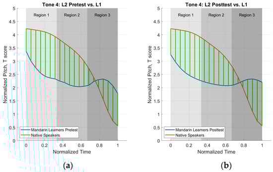 Tone 4 deviation plots. (a) L1 vs. L2 pretest averages; (b) L1 vs. L2 posttest averages.