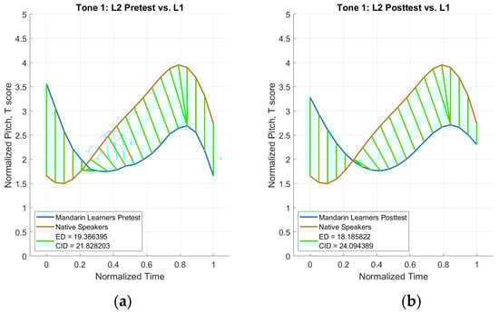 Tone 1 distance plots. (a) L1 vs. L2 pretest averages; (b) L1 vs. L2 posttest averages.