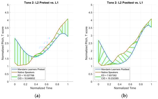 Tone 2 distance plots. (a) L1 vs. L2 pretest averages; (b) L1 vs. L2 posttest averages.