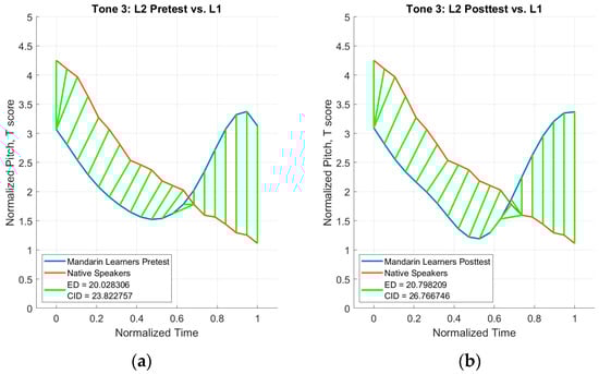 Tone 3 distance plots. (a) L1 vs. L2 pretest averages; (b) L1 vs. L2 posttest averages.