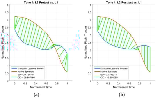 Tone 4 distance plots. (a) L1 vs. L2 pretest averages; (b) L1 vs. L2 posttest averages.