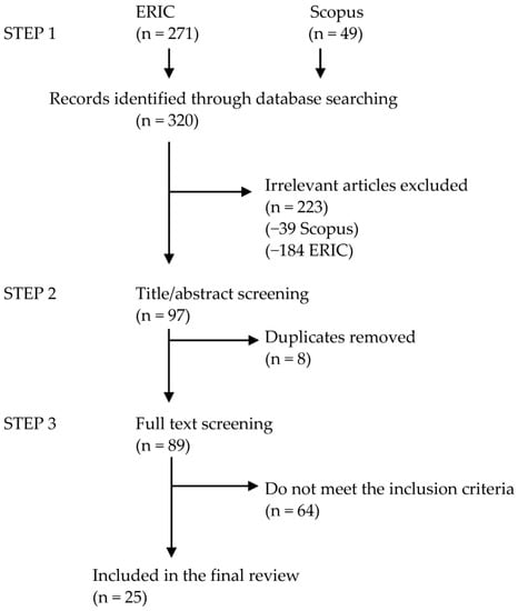 As shown in Figure 1 below, 320 studies were identified in the initial search process (Step 1), out of which 223 studies did not meet the inclusion criteria specified above and were excluded from the search. A total of 97 studies’ titles and abstracts were screened in Step 2; duplicates were removed (n = 8). The authors took the possibility of conducting an additional search to double-check that they were not excluding any other valuable contributions of interest to this study. The team started the next phase of screening when 75% (or greater) agreement was achieved in Step Two (The JBI Manual for Evidence Synthesis, Aromataris and Munn 2020). The number of articles selected for Step Three was 89. Full-text screening allowed the researchers to remove 64 studies that did not meet the inclusion criteria specified above. The articles were checked a few times by all of the reviewers. In total, 25 studies remained suitable for inclusion and data charting. The files with the searches were stored online so that all of the reviewers had access to them at all times. Having an odd number of reviewers helped to resolve any discrepancies and discuss any arising issues to prevent bias (The JBI Manual for Evidence Synthesis, Aromataris and Munn 2020).