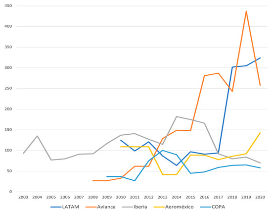 The possibility of including low-cost airlines in the sample was rejected from the very beginning—the large differences in business model between low-cost airlines and traditional airlines cast doubt on the comparability of the two. The problem, however, was solved by the finding that, in general, potential candidates do not publish CSR reports. This may be partly due to the fact that they are smaller companies. One exception is the Mexican airline Volaris, founded in 2005, which published CSR reports in 2017 and 2018, a sustainability report in 2019 and an integrated report in 2020. In any case, as no comparable samples were found in other countries, it was decided not to include these reports in the corpus.