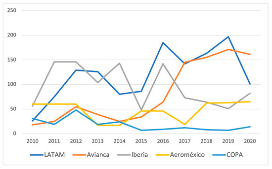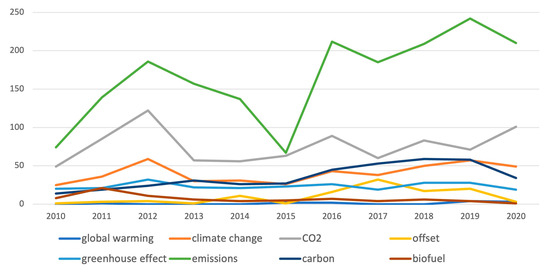 The analysis of the corpus of reports published by the five airlines between 2010 and 2020 revealed significant differences between them in the frequency of appearance of terms related to climate change. The mentions, broken down by year and company, can be seen in Table 3, which shows that two of the companies, Aeroméxico and COPA, remain well below the rest in relation to the total number of occurrences of terms related to climate change. In the case of Aeroméxico, it should be noted that only 8 reports are included in the corpus, instead of 11 for the other companies. This is due to the fact that the Mexican company published a single report on three occasions, covering two or three years.