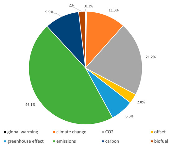 As we can see, the most frequently used terms are ‘emissions’ and, to a lesser extent, ‘CO2’, and they are also the ones that show the greatest volatility. In fact, the graph shows a minimum of occurrences in 2015, which coincides with the end of the first phase we highlighted in Figure 2. On the other hand, the use of ‘global warming’ is almost non-existent throughout the period. The use of ‘carbon’ appears mainly in the collocation ‘carbon footprint’ (127 out of a total of 390 occurrences), ‘carbon credits’ (37 occurrences) and also ‘carbon neutral’ (45 occurrences). For ‘greenhouse’, the vast majority of examples are of the term ‘greenhouse gases’, often abbreviated to GHG. The term ‘offsetting’, which is closely related to ‘carbon credits’, increases slightly in the second phase, while the use of ‘biofuel’, which is also very limited, becomes progressively less important.