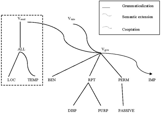 - Lord, Carol, Foong Ha Yap, and Shoichi Iwasaki. 2002. Grammaticalization of ‘give’: African and Asian perspectives. In New Reflections on Grammaticalization. Typological Studies in Language 49. Edited by Ilse Wischer and Gabriele Diewald. Amsterdam and Philadelphia: John Benjamins, pp. 217–35. [Google Scholar] [CrossRef]
