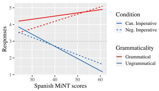 Figure 5. Spanish MiNT scores effects on the heritage speakers’ AJT responses across grammaticality (red vs. blue lines) and conditions (solid vs. dashed lines).