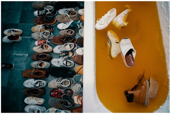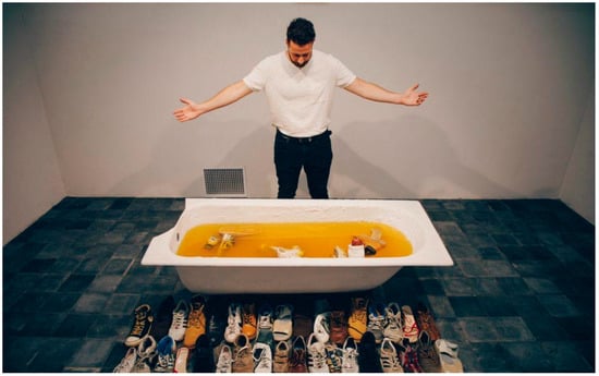 A sense of continuity links this installation with Foresta’s previous work, Mare Vostrum (Figure 3 and Figure 4), formed by a bath with yellow water, evoking African colours, with shoes of missing migrants, both in and outside the bath, and occasionally the presence of the silent artist. Dressing a bare room with strong colours was for Foresta a way to convey one of the most painful human experiences. The shock provoked by the colours evoking the origins of many migrants, and the shoes belonging to people who died crossing the Mediterranean, leave the artist, like each of us, speechless, as Figure 3 shows. Foresta’s installation, stretching back to and connecting Shoah victims to migrants who died in the Mediterranean, “congela lo spettatore in un crucciante silenzio: questo effetto lo si può sentire anche se la sala in cui è esposta è affollata” (it freezes spectators in a painful silence: this can be felt even when the exhibition room is crowded), as a critic claims (). Mare Vostrum was part of the 2019 modern art exhibition Cambio pelle (I am changing my skin) in the Contemporary Art Exhibition Centre of Caltanissetta.
