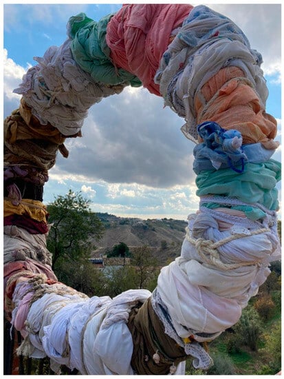 In Polezzi’s words, “artwork related to migration also asks us to interrogate ourselves as spectators, readers, viewers, about our own narratives […] It is that interpellation of us, of our position and our response which is also an integral part of re-thinking translation as co-presence, rather than substitution ()”. Foresta’s co-creation with local citizens and migrants does this, it is a way to encourage new ways of thinking about peace and hospitality and those clothes become part of a present which is still looking for peace. It is an opportunity to go beyond labels such as “dublinante”, identifying migrants and asylum seekers through rigid categories, and to acquire an active role in defining our relationship with the Other on the basis of our individual experience as human beings. Pace Nostra continues, so to speak, and concludes through the cycle’s third work, Mediterraneo Mio (My Mediterranean, Figure 5), which represents the end, physical as well as metaphorical, of a circle, covered in clothes, in an open space, devoted to a permanent exhibition, always in Caltanissetta. It is a closed circle symbolizing the end of suffering thanks to a united mankind.