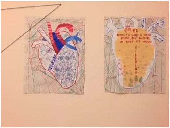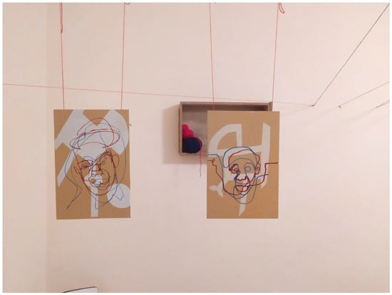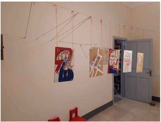 The interactive exhibition, which took place on the 10th of February 2022, offered portraits painted by migrants, working in pairs, by looking at each other with the aim to portray only some elements of the other person’s face. Those portraits were not meant to be well-defined to symbolize the fluid and complex nature of migrant identities. They were hanging at eye level forcing viewers to come into close contact with the paintings (see Figure 6 and Figure 7). As viewers entered the room where the paintings were hanging, we could not turn in the other direction and help but look at those faces very closely. The exhibition also included installations with hearts, representing both human hearts as well as the city’s heart (Figure 8), which had been reinterpreted with painted cornices and through alternative “relational maps”, including photos of migrants (Figure 7). Blue and red lines were recurrent: they were used in the portraits, in the maps and in the hearts’ veins. The heart symbolises a point of arrival and a new departure for its central role in activating emotions in relationships.