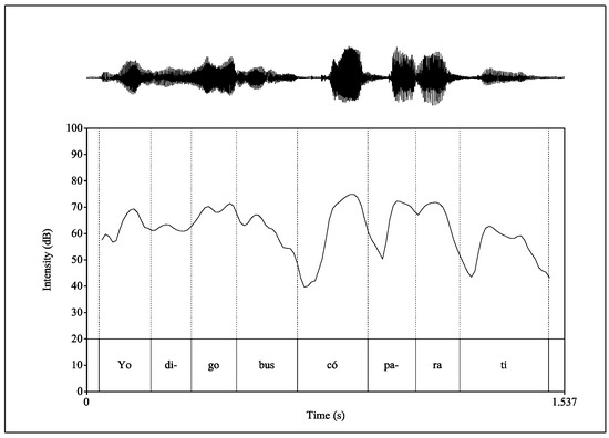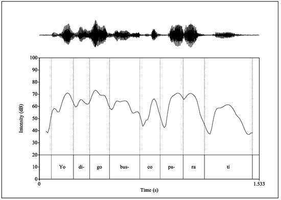 Figure 2 includes the spectrogram and intensity curve for the utterance Yo digo busco para ti (‘I say I look for for you’). Within the boundaries of the syllabus bus- in Figure 2, the minimum intensity value of [b] is 57.1 dB, and the maximum intensity value of the following vowel [u] is 64.6 dB, yielding a RI difference of 7.5 dB. The lower RI value of this consonant [b] indicates a more open production than the [p] analyzed in Figure 1.