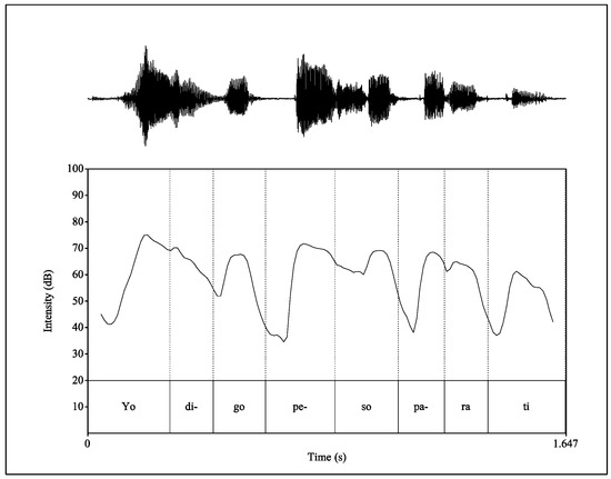 Intensity curve of the phrase Yo digo peso para ti ‘I say weight for you’ produced by a speaker from Málaga, Spain (speaker SSp4).