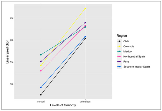 Predicted RI values of the two-way interaction between region and sonority.