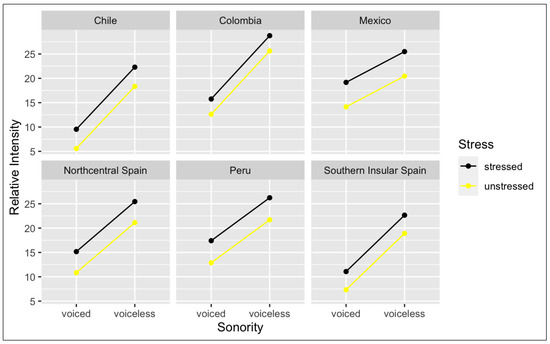 As discussed previously, studies on consonant lenition in Spanish have shown that consonant segments in stressed syllables are produced with less consonant weakening than those in unstressed syllables. This was illustrated in Figure 2 and Figure 3 in Section 2.4 on variables. The data presented in Table 5 present descriptive RI measurements according to Spanish variety and lexical stress. Overall, occlusives in stressed position have higher RI values than those in unstressed position; this is confirmed by a main effect of stress (χ(1) = 395.17; p < 0.005). Overall, voiced and voiceless consonants are realized with distinct RI. There is not, however, a two-way interaction between stress and region, meaning that the effect of stress on RI does not depend on region (χ(5) = 6.94; p < 0.225).