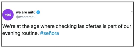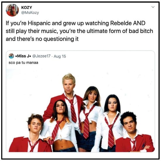 The target audience of the page is listed as internet users between the ages of 18 and 44. In a 2015 interview, the mitú cofounder, Beatriz Acevedo, noted that one of the goals of the organization was to be the “voice of the millennial generation”.4,5 In this vein, much of the page’s content contains overt acknowledgement of the age of its intended audience. For example, the post in Figure 1 claims that “we”, referring to both the poster and the intended audience, are old enough to be spending time looking for shopping deals (las ofertas). Furthermore, the post includes the hashtag #señora, a term used in Spanish to refer to either a married or an older woman. Additionally, many cultural references within these posts relate to things that were popular among adolescents in the early 2000s, when millennials were coming of age. For example, Figure 2 and Figure 3 refer to the Mexican television show, Rebelde, which aired during this time of millennial adolescence.