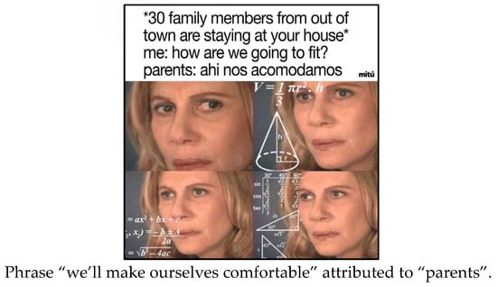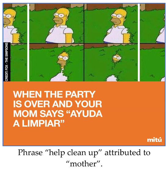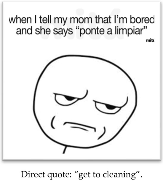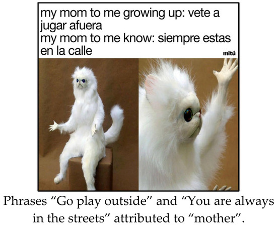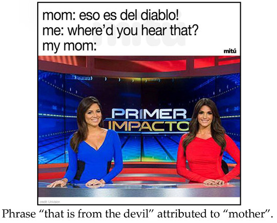 As in Johnstone’s (2011) description of the characterological figures in radio skits, the depictions of motherhood displayed in these memes have the potential to enregister language forms within more than one cultural schema, because what is salient depends on the listener or, in this case, the internet audience. For example, for U.S. Latinx millennials who grew up with Spanish-speaking mothers, this pattern can serve to further enregister the relationship between use of the Spanish language and motherhood, not unlike the abuela figure described in Gutiérrez (2021). More broadly, even for those audience members for whom there is not a strong personal connection between speaking Spanish and motherhood, the content of the memes themselves may enregister certain practices stereotypically associated with motherhood,10 such as domestic activities and monitoring children’s behavior. In this way, both what is depicted in these memes and how it is depicted play a role in (re)enregistering the “mother” figure for U.S. Latinx millennials.