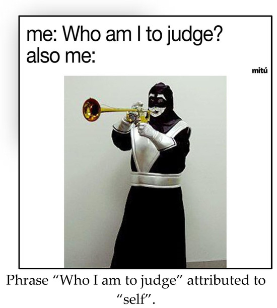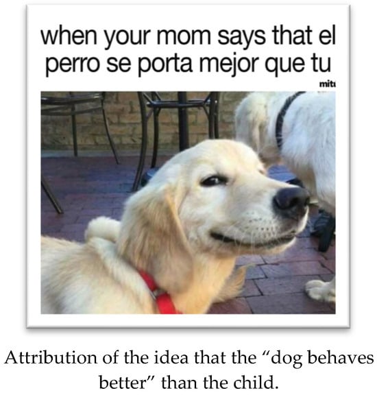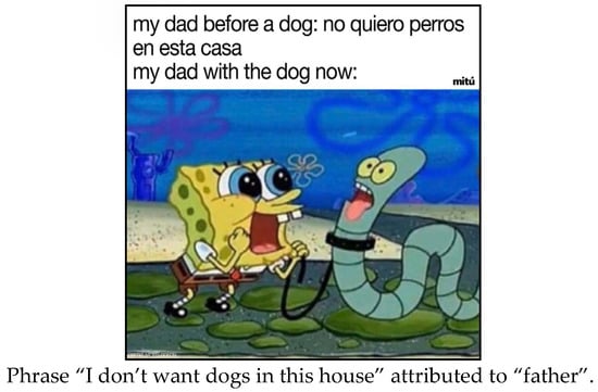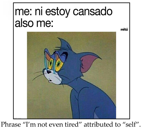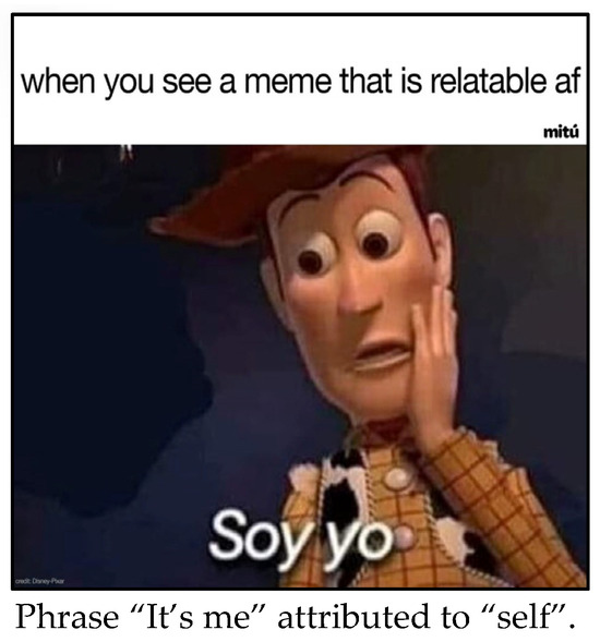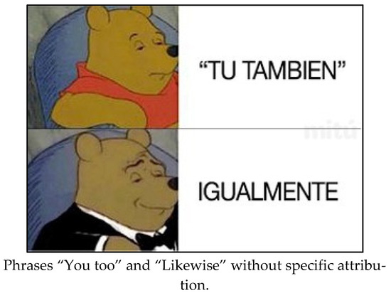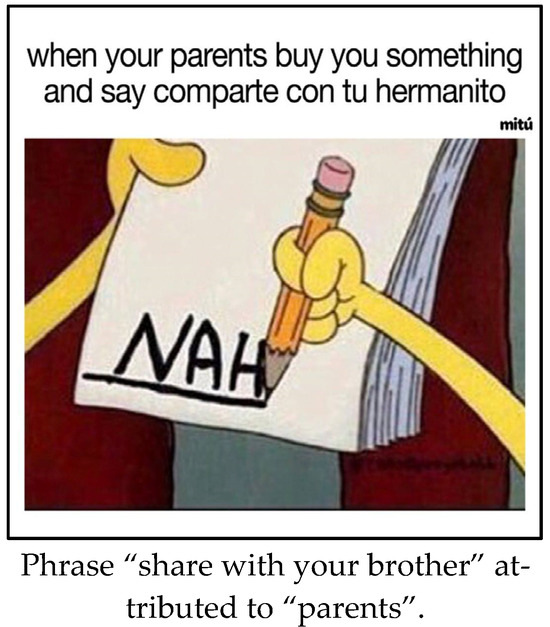 Additionally, the terms quotative switch and attributive switch both refer to instances where words are credited to a specific speaker, with the former referring to situations where the language appears as a direct quote in quotation marks (Figure 8) and the latter referring to cases where the language is attributed to another speaker (Figure 9), for example, in a subordinate clause. Both types exhibited similar patterns in the present data set, and therefore, were collapsed into a single quotative/attributive classification. After determining the type of switch(es) included in each meme, the direction of the switch was categorized as either English-to-Spanish or Spanish-to-English.