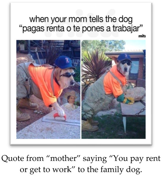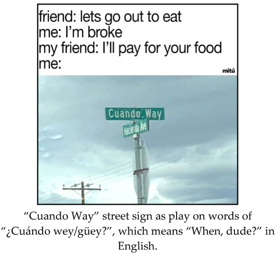 Given that the present study focuses on how codeswitching is deployed within the memes posted to mitú, it is critical to establish what is meant by the term. There has been a debate in linguistics about codeswitching typologies and what exactly constitutes true codeswitching. Nevertheless, it is generally agreed that the terms intersentential and intrasentential codeswitching refer to complete switches from one language or variety to another between and within sentence boundaries, respectively (Poplack 1980; MacSwan 2014; inter alia). A more contested type involves the use of a lexical item from one language within a different matrix language. The literature has used a variety of terminologies to describe this, including insertion and borrowing (Poplack 1980; MacSwan 2014; Muysken 2000; Woolford 1983; inter alia), though these phenomena have often been differentiated from other types of language mixing and have traditionally been classified as falling outside of the umbrella of codeswitching (Poplack 1993, pp. 255–56, 279). However, Muysken (2000, p. 69) suggests that, while there may be formal, structural differences between borrowing and codeswitching, they can fulfill similar discursive functions, such as the symbolic role of marking multicultural identity. Backus (2015) also follows this assertion, stating that, while borrowings and codeswitching may differ diachronically, their synchronic function and sociopragmatic indexicality are often the same. Therefore, codeswitching is used in the present work as a pre-theoretical term that encompasses all of the aforementioned types of language mixing, including all instances of Spanish and English being used together in the same discursive context. Following Androutsopoulos (2015 p. 187), multilingualism can be better examined when considering “any discourse that draws on resources associated with more than one language”. Additionally, so-called hybrid linguistic forms (e.g., stress-itos, an English word with a Spanish diminutive suffix) can be included in this umbrella, going beyond a simple mixture of first and second languages (Wei 2018), and can play a role in identity construction (Wei 2011; Wei and Lin 2019). Importantly, this approach to codeswitching allows more robust analysis in that it permits us to observe all possible cases of multilingual discourse rather than being unnecessarily restrictive.
