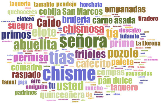 Figure 13 provides a visual representation of the distribution of the different words that constituted the lexical switches found in these memes. In this word cloud, the size of the word corresponds to its frequency of occurrence, i.e., words that are represented in larger text occurred more often than words that are represented in smaller text. For example, chisme (‘gossip’) occurred as a lexical insertion fourteen times, whereas padrinos (‘godparents’), as shown in the lower left corner of the image, occurred only twice. As can be observed in the image, many of the more frequent words represent food items (e.g., elote, a grilled corn dish typical of Mexico, and lomo saltado, a dish made with meat and French fries typical in Peru), kinship terms (e.g., abuela ‘grandmother’ and tía ‘aunt’), and culturally specific artifacts, traditions, or practices (e.g., quinceañera, a traditional 15th birthday celebration for girls, and lotería, a card-based game of chance typical in Mexico).