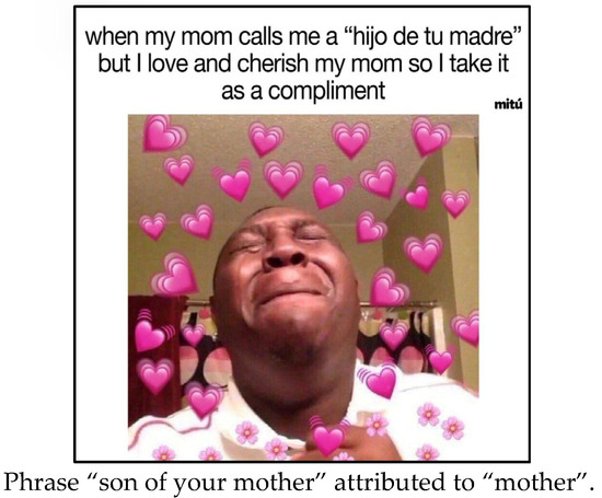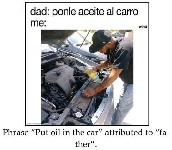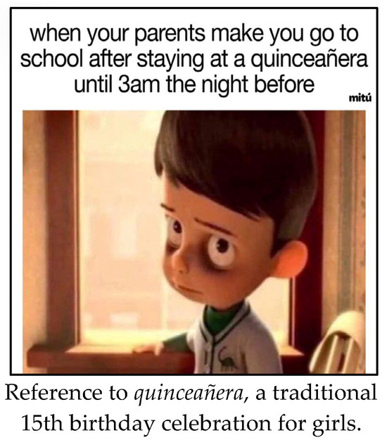 Relatedly, many familial and kinship terms appear as Spanish words inserted into English clauses in these data, including abuela (‘grandmother’), primo (‘cousin’), tía (‘aunt’), tío (‘uncle’), padre (‘father’), sobrino (‘nephew’), and suegra (‘mother-in-law’). These words provide a clear example that supports Backus’ (2001) proposal that highly specific words, as defined by the norms of the particular community they are used in, are more likely to be inserted. In some cases, as with the previously described food items, Spanish words are used where part of the meaning would be lost in translation. For example, the literal translation of amiguito would be something like ‘little friend’ in English, but in the memes analyzed here, it is used to talk about a romantic partner that is not necessarily serious or exclusive. This recruitment of familial and kinship terms in Spanish instead of using the corresponding terms in English suggests differences in the sociopragmatic meaning of the English and Spanish words. Therefore, upon closer examination, the words that are selected for lexical switches in these memes are not only highly specific and difficult to translate into English, but also reflect cultural practices that are closely connected to identity and are often meant to evoke meaning beyond the semantic meaning of the word (Kosoff 2014; Mahootian 2005).