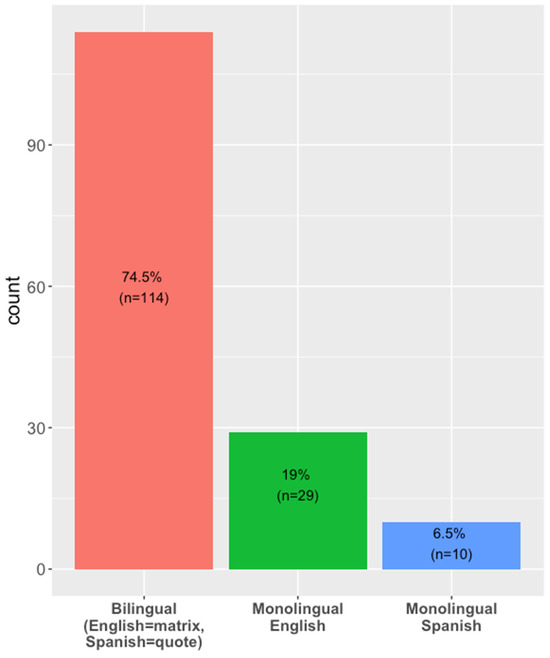 The majority of the quotative/attributive switches in the corpus consisted of Spanish quotes embedded within English matrix clauses (74.5%, n = 114), which are the focus of the present analysis. The remaining 25.5% (n = 39) of the memes based on the quotative template were monolingual, broken down into English quotes within English matrix clauses (19.0%, n = 29), and Spanish quotes within Spanish matrix clauses (6.5%, n = 10). There were no instances of English quotatives embedded in Spanish matrix clauses in the present data. These patterns are visualized in Figure 17.