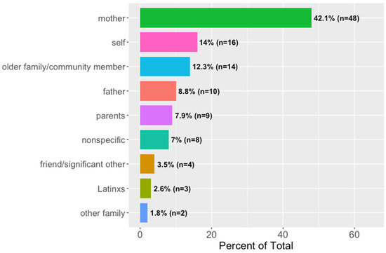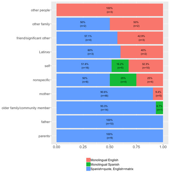 Figure 19 contextualizes these findings by showing the rates of quotes attributed to these imagined speakers across the different quotative templates. First, the quotes attributed to “parents”, “father”, and other family/community members occur categorically in Spanish. Second, the quotes attributed to the “mother” figure occur in Spanish 90.6% (n = 48) of the time and in English 9.4% (n = 5) of the time. Additionally, the figure of the “self” is depicted as frequently speaking both English (32.2%, n = 10) and Spanish (67.8%, n = 21). This reveals a tendency not only to attribute speech to the aforementioned figures, but also to attribute different language patterns to them. Finally, “other people” (e.g., Uber driver or teacher), “other family member” (e.g., cousins or aunts), “friends/significant others”, and “Latinxs”, in general, occur at higher rates in English quotatives.