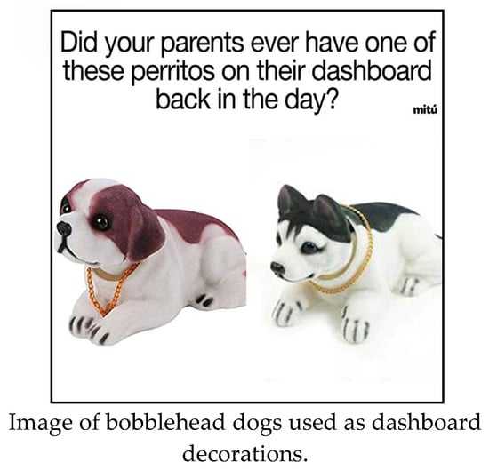The primacy of mixed code in the corpus reflects the critical roles of both English and Spanish in the enregisterment of U.S. Latinx linguistic patterns. In particular, the collected memes reflect Krogstad and Gonzalez-Barrera’s (2015) findings that 70% of participants of approximately millennial age reported using “Spanglish”. These previous findings, in combination with the frequent use of English and Spanish within a single meme in the present data, illustrate the processes of the enregisterment of these linguistic patterns in virtual social spaces. The following sections will detail the ways in which the patterns of language use in these memes enregister mixed code, cultural artifacts, and Spanish-speaking parents as part of the U.S. Latinx millennial experience, offering the possibility for the construction of a collective identity.