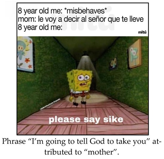 While the instances of quotative mixed code in these memes may be, in part, reflective of the documented process of intergenerational language shifts, their messages also rely on more nuanced sociopragmatic and symbolic meanings. A wealth of previous studies have found that particular linguistic forms, in this case, codeswitching, can be used in internet communication to convey in-group membership and construct group identity (Androutsopoulos 2006; Dorleijn and Nortier 2009; Zappavigna 2012; inter alia). In the case of the present data, the expression of culturally specific lexical items and Spanish quotes attributed to older family members works to establish linguistic and cultural patterns that communicate the sociopragmatic meaning of being in an environment where Spanish is used, constructing a collective imagination of the U.S. Latinx millennial experience.